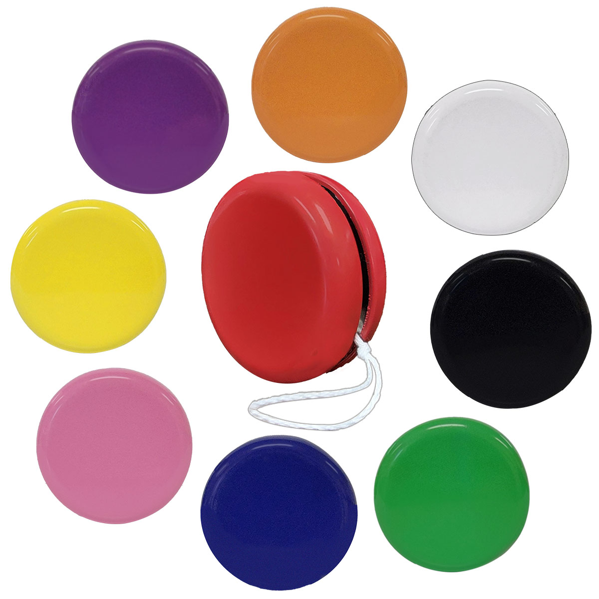 Choose our fashionable and well-balanced yoyo in bright colors for your next promotion. This delightful yo-yo is approximately 2" in diameter. Well balanced yoyo for a smooth up and down action. Perfect for trade show giveaways, party favors, Bar Mitzvah gifts, outdoor events and many other occasions. Available in bright attractive colors of: red, blue, green, orange, pink, purple, black, white and yellow.